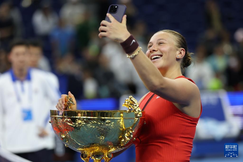 10月5日,中网阿尼西莫娃在颁奖仪式上与奖杯合影。阿尼