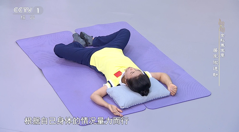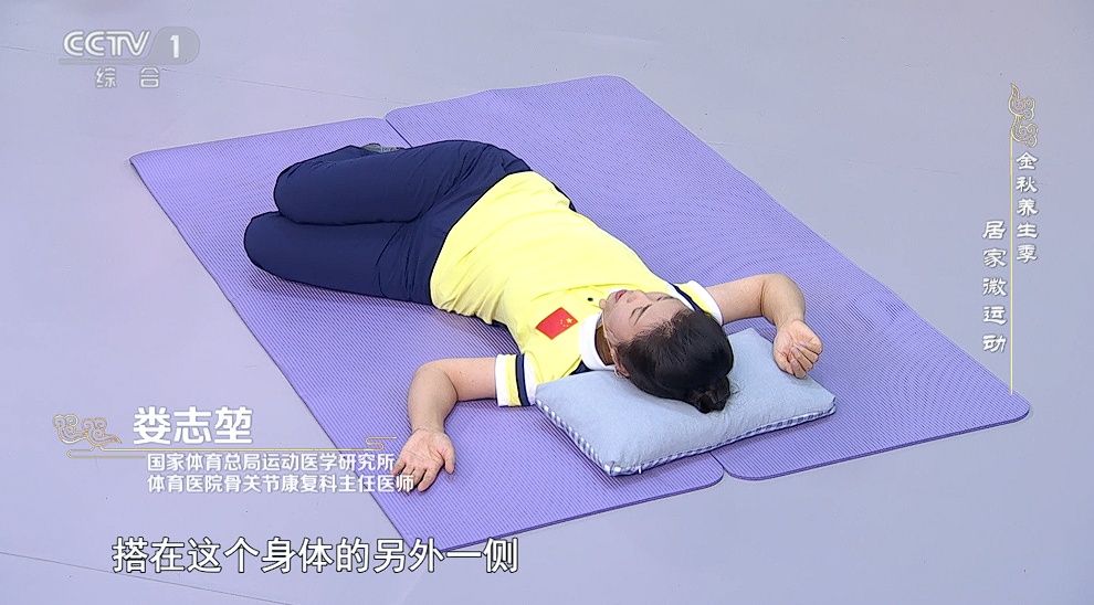 上肢翻书:仰卧屈膝屈髋,双上肢水平展开后合拢(模拟翻书动作),重复3~5次,放松肩背部。