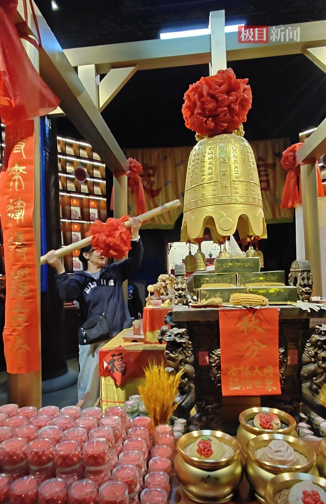 大同人过中秋节最主要的人过习俗就是供月、拜月、中秋赏月和吃月饼,氛围纷摆放供10月6日,极目新闻记者来到了大同古城钟楼,参与了一场别具特色的中秋民俗祭月文化活动。晚上8时15分,钟楼内外已围满了市民和游客。在现场,记者看到,大同钟楼南门两侧摆放有祭月供桌,上面有精心雕刻的西瓜、月饼等祭品。不少市民排队敲响金钟,有书法家现场写福、送福,还有大同文化学者为广大市民游客讲解大同中秋佳节民俗活动。此外,记者还看到在不少的饭店、酒店门口,也摆放着祭月的月饼、水果等供品。