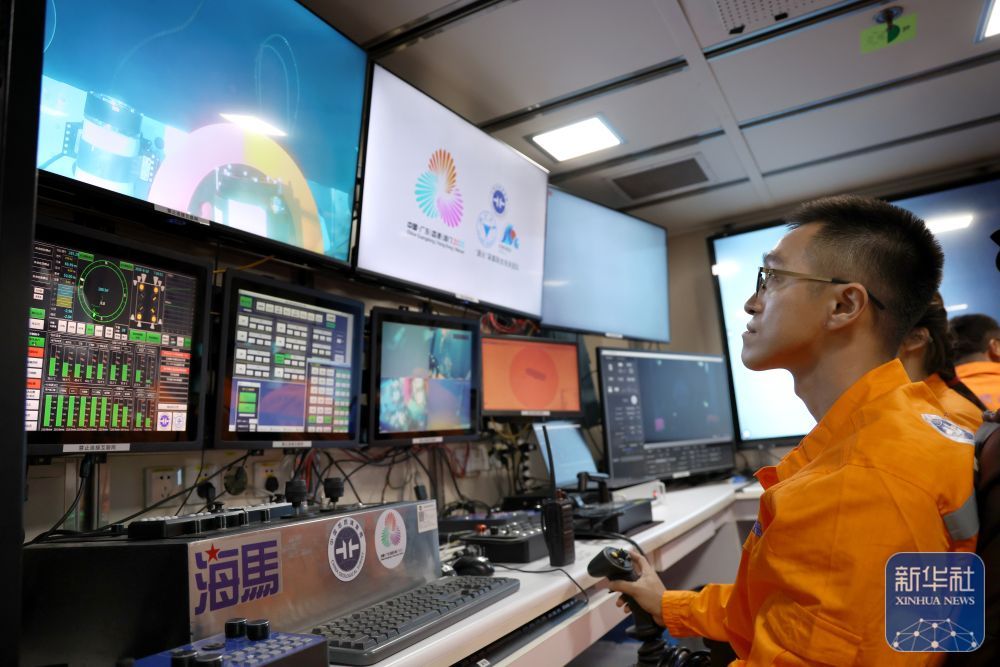 ↑9月18日,在科考船上的“海马”号深海遥控潜水器控制室里,工作人员遥控采火装置在海底进行作业。新华社记者 卢汉欣 摄