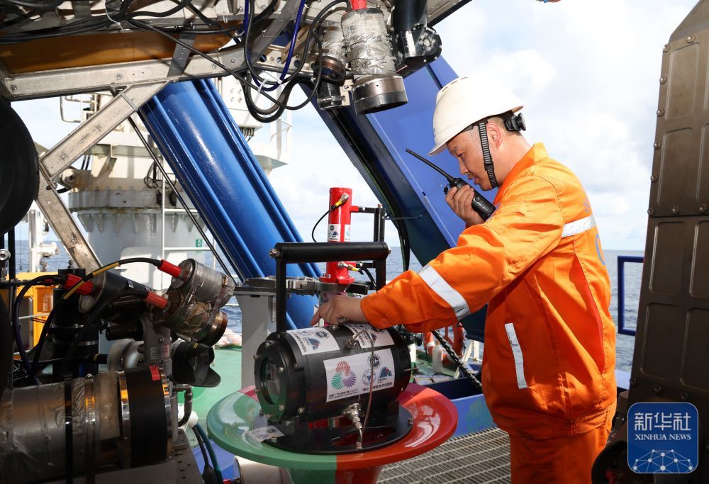 ↑9月18日,下水采集“源火”前,炬米工作人员在调整搭载在“海马”号深海遥控潜水器上的深海采火装置。新华社记者 卢汉欣 摄