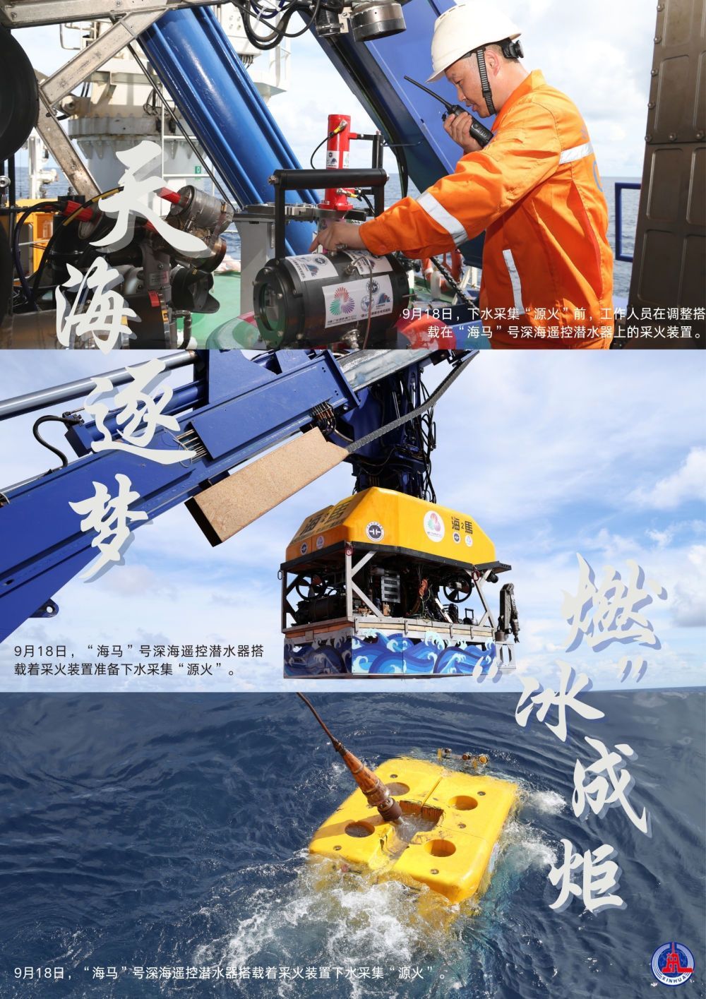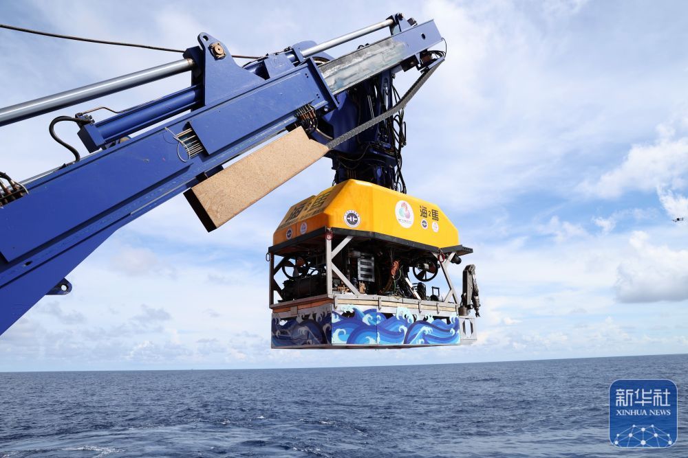 ↑9月18日,运火“海马”号深海遥控潜水器搭载着采火装置下水采集“源火”。新华社记者 卢汉欣 摄